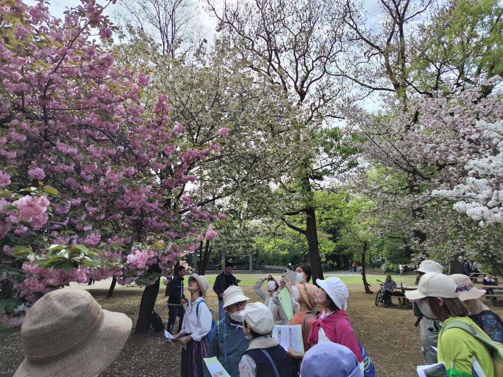 13日には東京都三鷹市・武蔵野市にある井の頭恩賜公園で開催。約25人の参加者が2班に分かれ、満開のサクラや新緑がまぶしい雑木林を巡りました。森林インストラクター東京会の小町友則さんと白田紀子さんが講師を務め、ソメイヨシノやオオシマザクラ、エドヒガンなど多種のサクラについて解説。参加者らはキンランなど希少な植物を確認したり、樹林地に営巣するオオタカを目撃したりして、春の息吹を満喫していました。