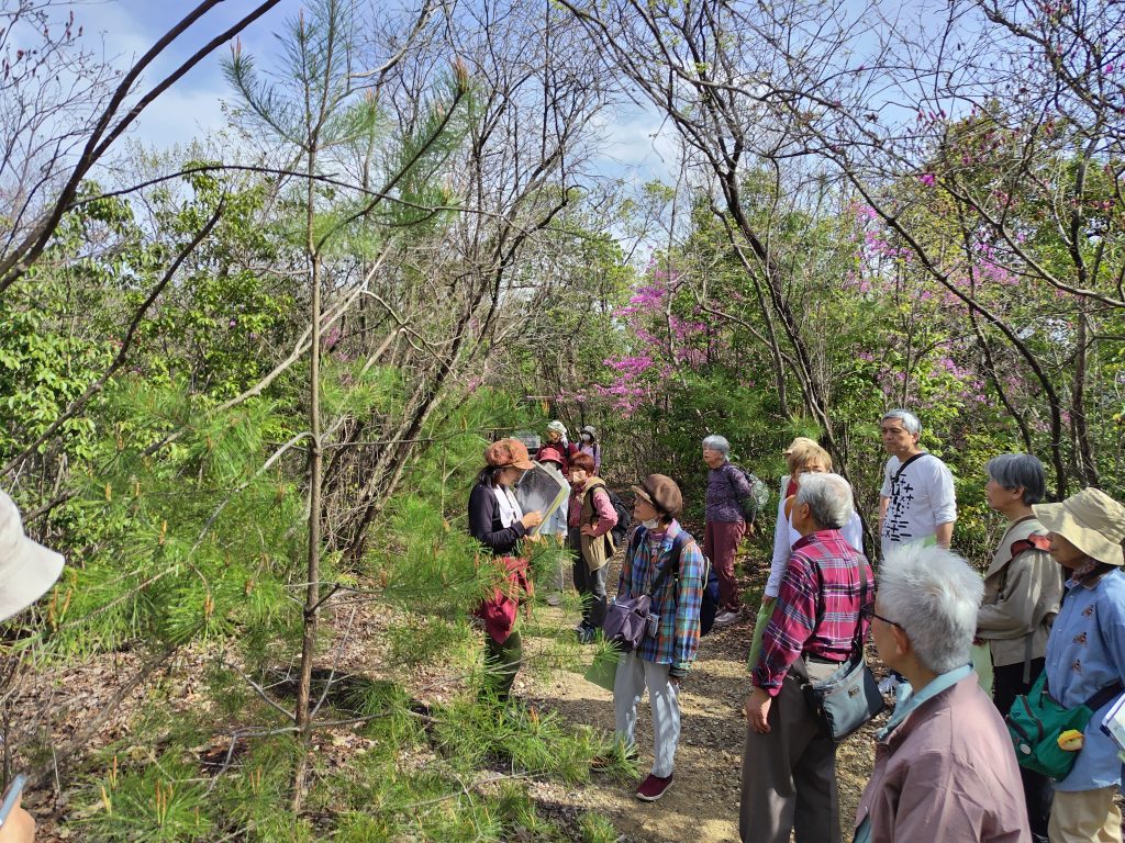 京都市左京区の宝が池公園で5日に催されたセミナーには、主に関西圏の約20人が参加。ソメイヨシノやミツバツツジが咲き誇る広場と遊歩道を散策し、季節の移ろいを肌で感じていました。講師に招いた京都市都市緑化協会の野田奏栄さんが公園の歴史について紹介したうえで、シカの食害やナラ枯れなどで周辺の森が荒廃の危機を迎えている現状を報告。被害状況を確認しながら生態系の維持について学びました。