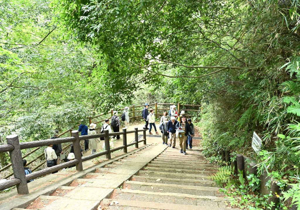 起伏のある生田緑地を散策する参加者