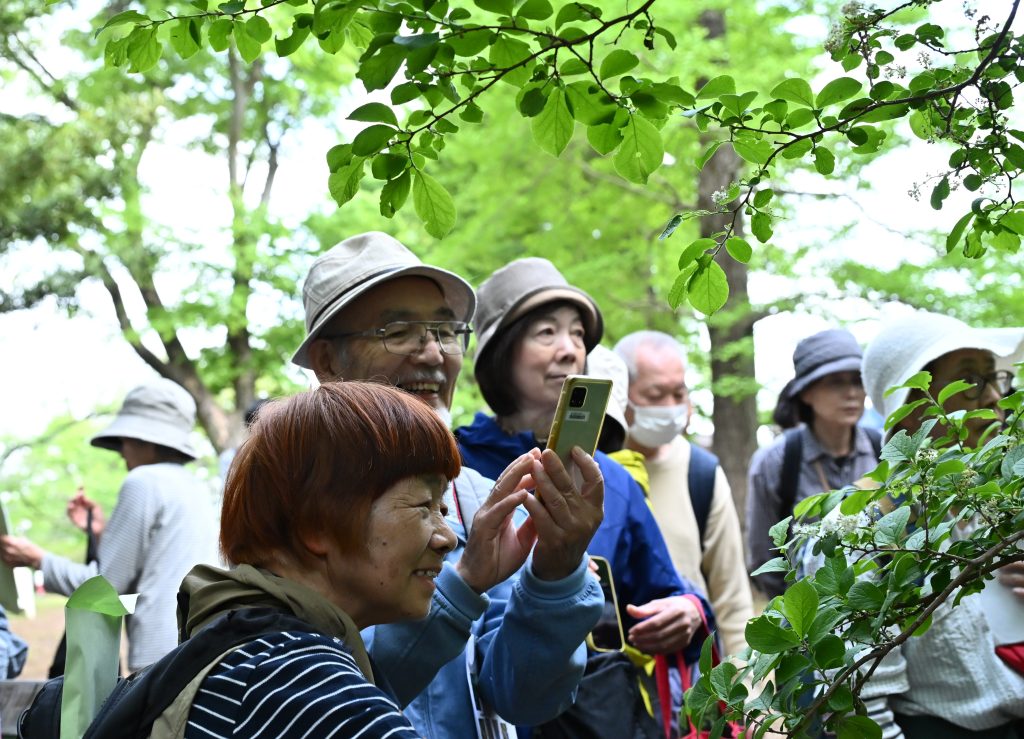 花が咲いていたサワフタギにスマホを向ける参加者