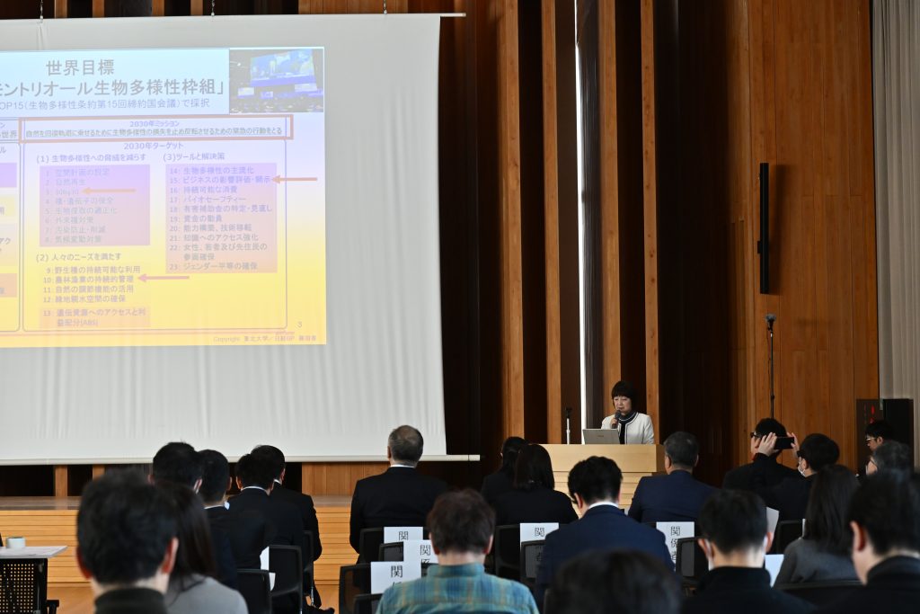 東北大教授、日経BP ESGフェローの藤田香さんが「森林を活用し、連携して取り組むネイチャーポジティブ」と題して基調講演を行いました。2030年までに生物多様性の損失を食い止めて回復に転じるネイチャーポジティブが、企業経営においても重要になっていることを指摘。そのうえで、森林が持つ価値を可視化することや、その技術が重要だと述べました。さらに、企業、自治体、市民団体、研究機関のマッチングや連携によって、ともに取り組むことが大切だと訴えました。