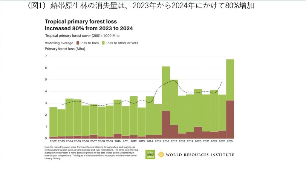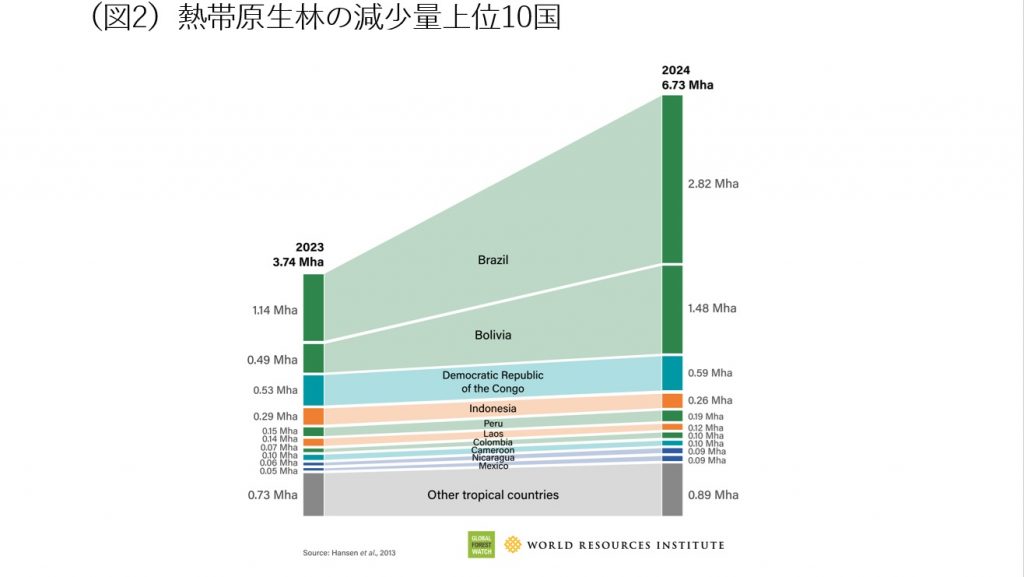 2024年の熱帯原生林の火災被害面積は2023年の5倍に達した。一部の生態系では自然発生する火災もあるが、熱帯林ではほぼ全てが人為的要因によるもので、農業用地開拓のための焼畑が原因で発生し、近隣の森林へ制御不能に拡大することが多い。2024年は観測史上最も高温の年となり、気候変動とエルニーニョ現象による高温乾燥状態が、より大規模かつ広範囲な火災を招いた。ラテンアメリカは特に深刻な被害を受け、ブラジルとボリビアで農業による原生林減少を、火災による減少が逆転した。