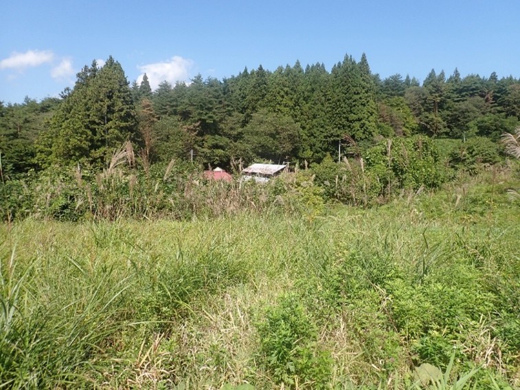 写真7 廃牛舎と荒廃牧野(今後の整備予定地)