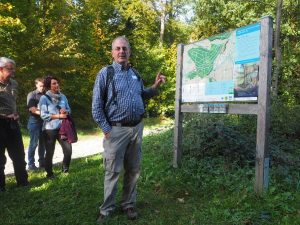 レンツバーグ地域の市民の森の状況について説明する地域森林企業レンツィアの責任者。3ヘクタールほどの埋葬森林がこの区域に含まれている(写真提供:Andreas Bernasconi)