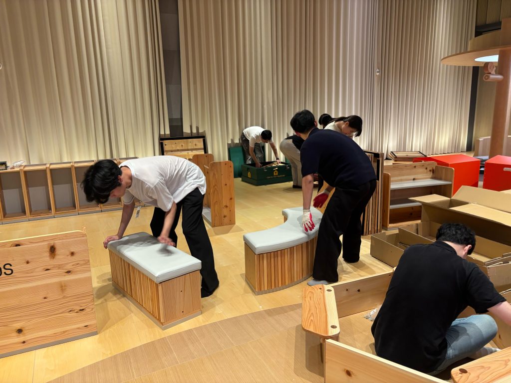 この日は百貨店の休館日を利用して大型遊具の設置を行いました。冷房が効いていない暑い会場で汗を流しながら、現地スタッフと協力して作業を進めました。覚えた韓国語を使いながら「暑いですが大丈夫ですか?」と声をかけ合い、おもちゃは実際に遊び方を教えながらセッティングしました。けん玉を気に入ったスタッフが多く、オープン前には日本のスタッフと同じくらいの実力をつけていて、とても頼もしく感じました。この共同作業を通じて距離が縮まっていくのを実感しました。