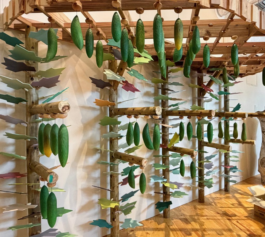 沖縄ではお馴染みの ゴーヤーとナーベラー(へちま) の収穫コーナー(首里城の端材)