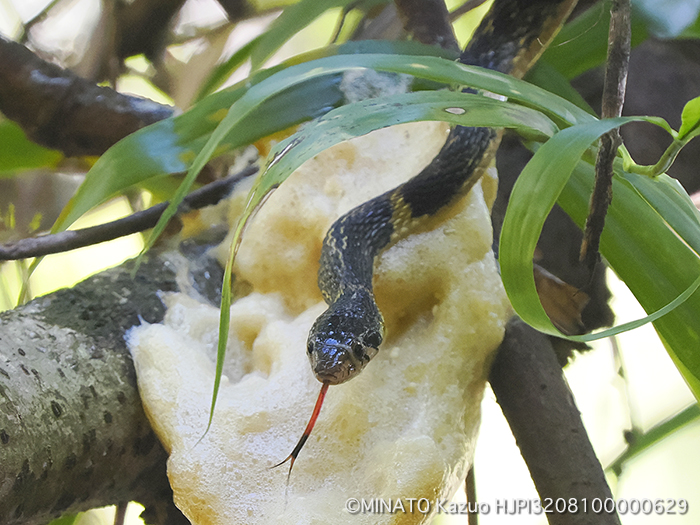 樹上のシロアゴガエルの卵塊に近づくガラスヒバァ。全長75〜110㌢メートル。沖縄諸島、奄美諸島に分布