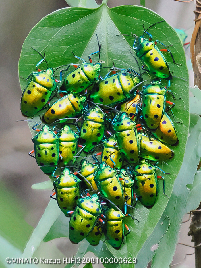 ナナホシキンカメムシは、カメムシ類としては大型な上に、メタリックグリーンの体色でとても目立つ。さらに集団で過ごすことが多いので。より目を引く存在だ。
